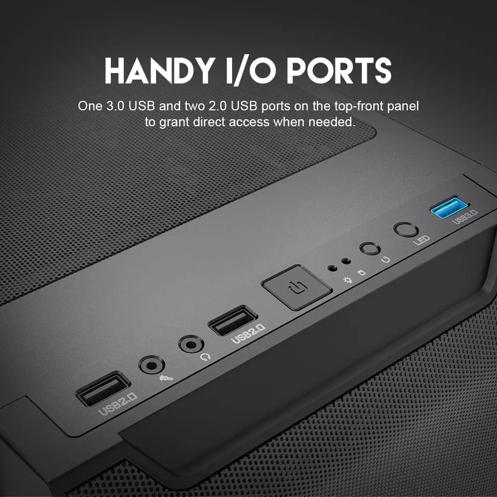 I/O port : USB 3.0*1, USB 2.0*2 , HD AUDIO, MIC, Reset, Power, LED button